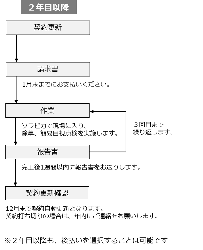 ・初年度のみ作業ごとの後払いで、2年目以降は年間費用の前払いとなります。