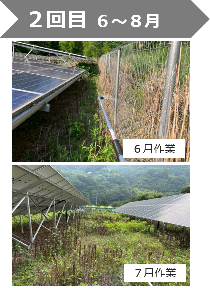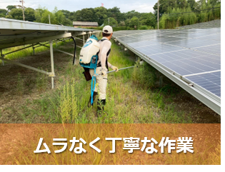 うちの現場は、残念ながら除草剤が使えないということで、草刈りでの対応となりました。少し追加料金になってしまったのは残念ではありますが、説明もきちんとして頂け、それがベストというのも理解できました。サービスでパワコン下に防草シートを無料設置して頂けたのは驚きました。
