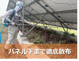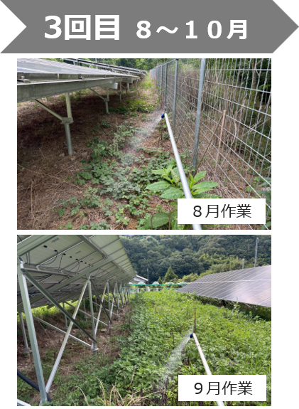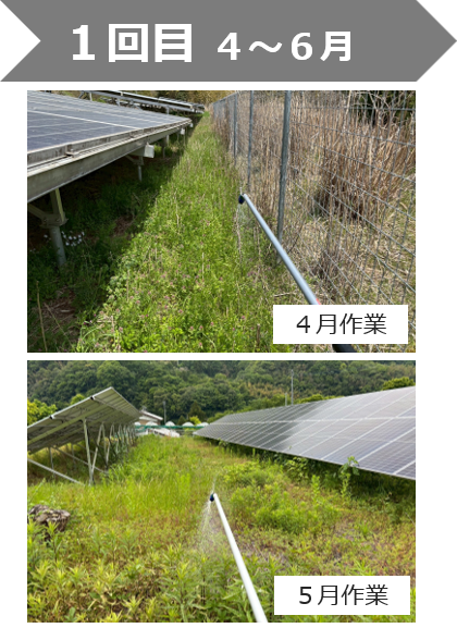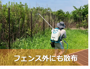 希釈・散布方法を守り、発電設備・人・周辺環境に配慮して作業しています。また、飛散防止対策、散布条件(風・天候)の管理、必要に応じた部分的草刈り、を組み合わせて、安全性を確保しています。