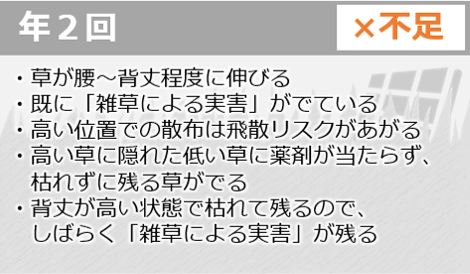 年2回の草刈りでは、草が低いうちに作業することは「コスト的に非効率」となり、必然的に、草が伸びきった状態での作業になります。その結果、1回目または2回目、あるいはその両方で、前ページで示した「除草をしないことで起きる実害」がすでに発生している状態となります。 つまり、草刈りは、最も負荷が高く危険なタイミングで人が現場に入らざるを得ない管理方法なのです。